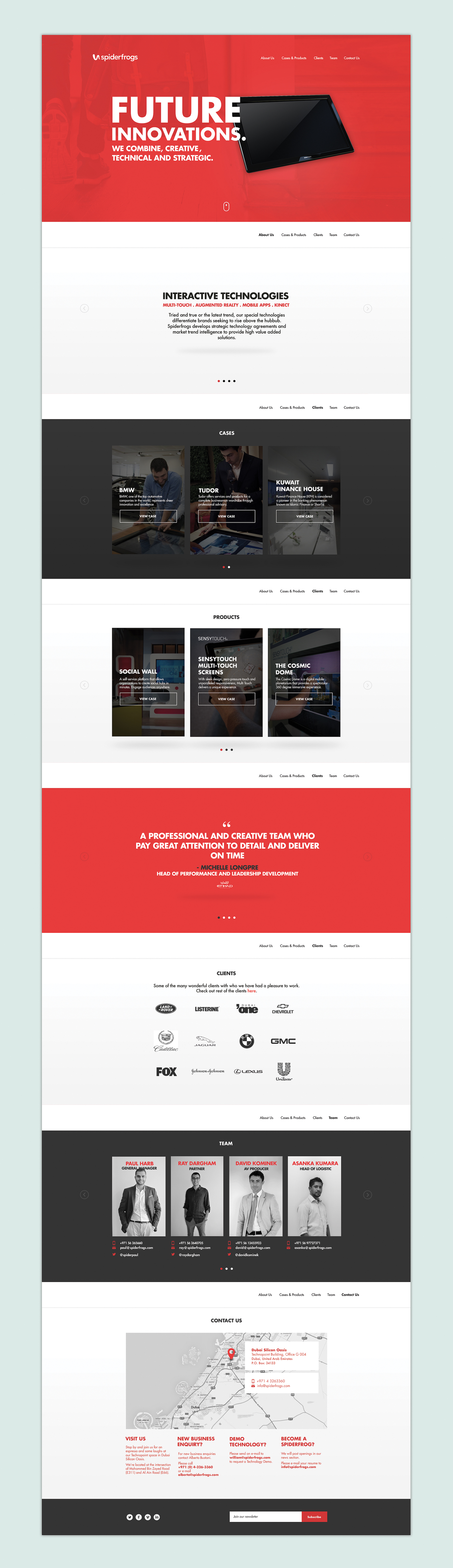 Spiderfrogs is a hi-tech innovation company located in Dubai. They create new ways to experience products and entertainment for their customers mixing media, technology and design. The case was to design a new visual identity and a modern responsive website to reflect what they do.